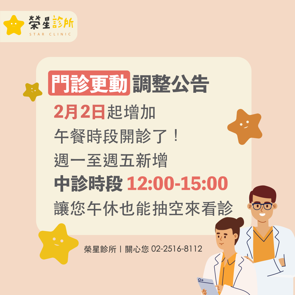 ⭐ 門診更動調整公告-增加中診時段 2026 年 1 月 23 日 由 starclinic 2月2日起增加 午餐時段開診了! 週一至週五新增 中診時段 12:00-15:00 讓您午休也能抽空來看診。